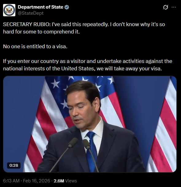 据Financial Express2月18日报道 本周,美国国务卿马尔科·鲁比奥(Marco Rubio)在布达佩斯与匈牙利总理欧尔班(Viktor Orban)联合记者会上再度表态,“签证不是权利,而是一种特权,我们可以随时收回。”