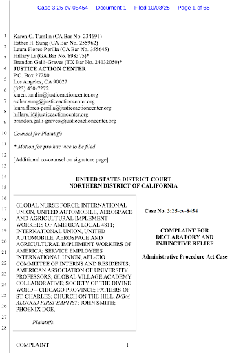 加州北区联邦地区法院:由工会、医疗机构、护士招聘机构、高等教育专业人士及移民权益组织等组成的联盟提起诉讼。