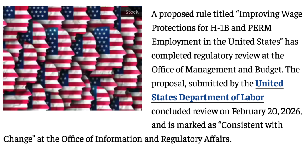 据《经济时报》当地时间2月24日报道,美国劳工部去年12月提交的一项拟议规则——“加强H-1B和PERM就业工资保护”——现已完成白宫预算管理办公室(OMB)的审查程序。