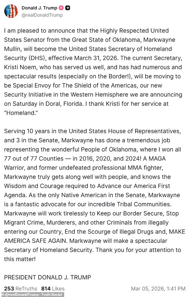 美国总统特朗普3月5日在社交媒体上宣布,国会参议员马克韦恩· 穆林(Markwayne Mullin)将从3月31日起担任美国国土安全部长,现任国土安全部长克丽丝蒂·诺姆将改任他职。
